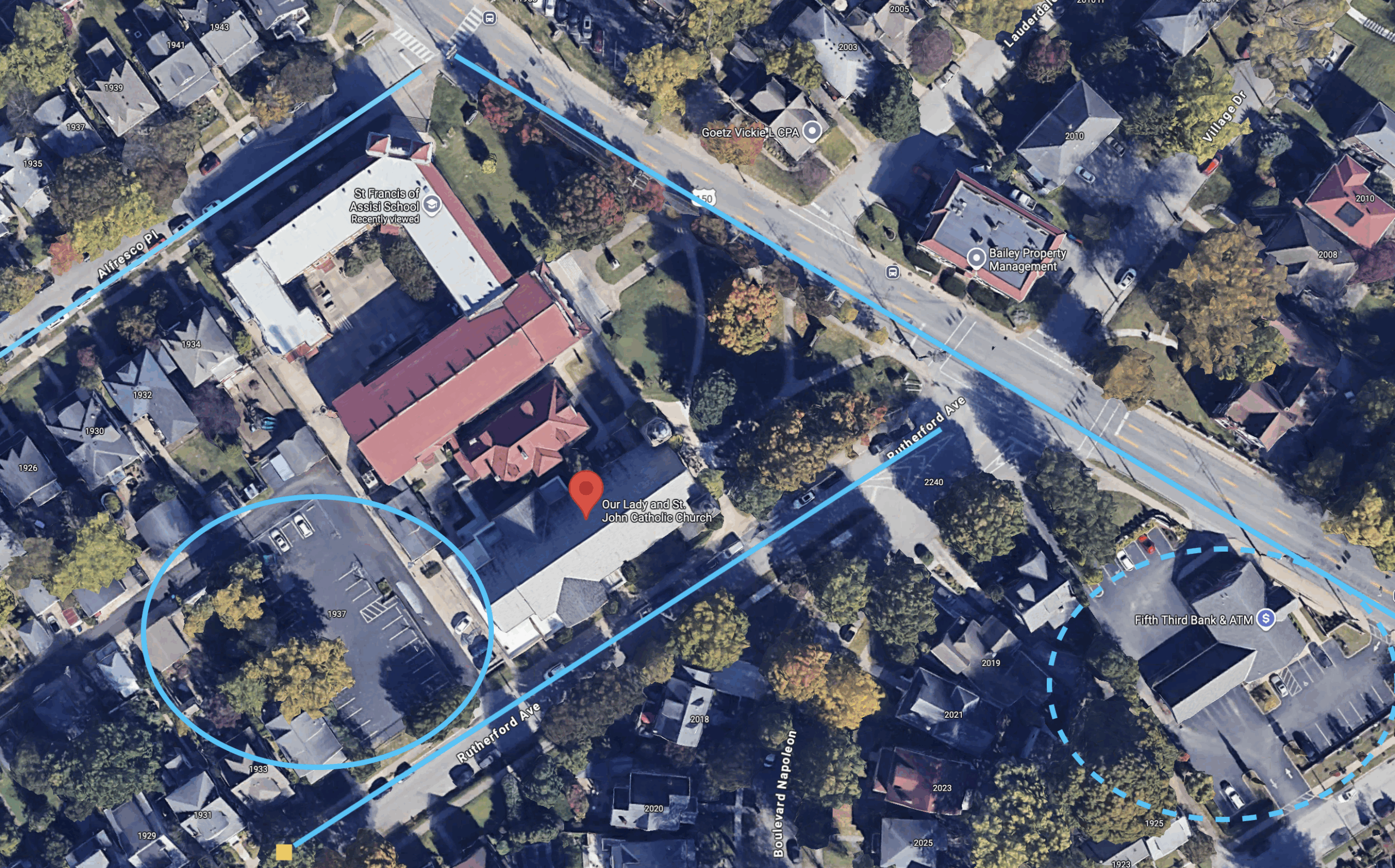 We have a parking lot behind the church, off Rutherford Avenue. Additionally, there is ample street parking on Rutherford Avenue, Alfresco Place, along Bardstown Road in front of the church, and elsewhere in the area. Suggested options are indicated in blue on the map below. On Sundays, you may use the lot at Fifth Third Bank (circled in dashes below).