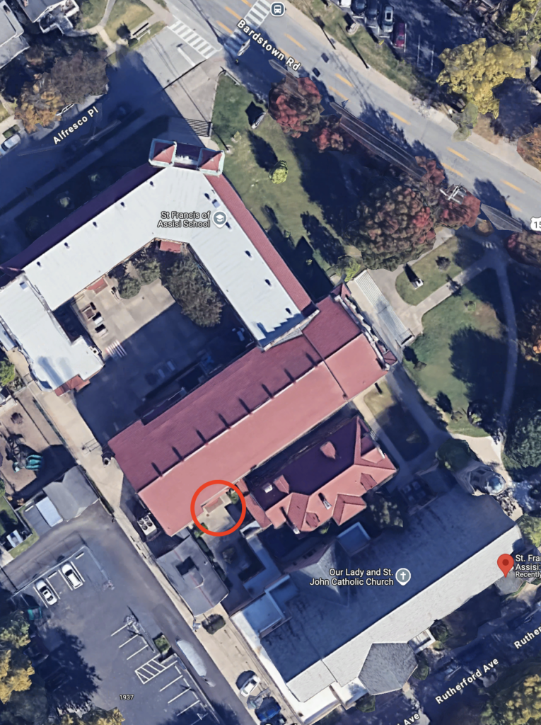 After every Sunday Mass, most parishioners and visitors come to the Parish Hall (red circle below) for Coffee Hour, consisting of coffee, snacks, and conversation.